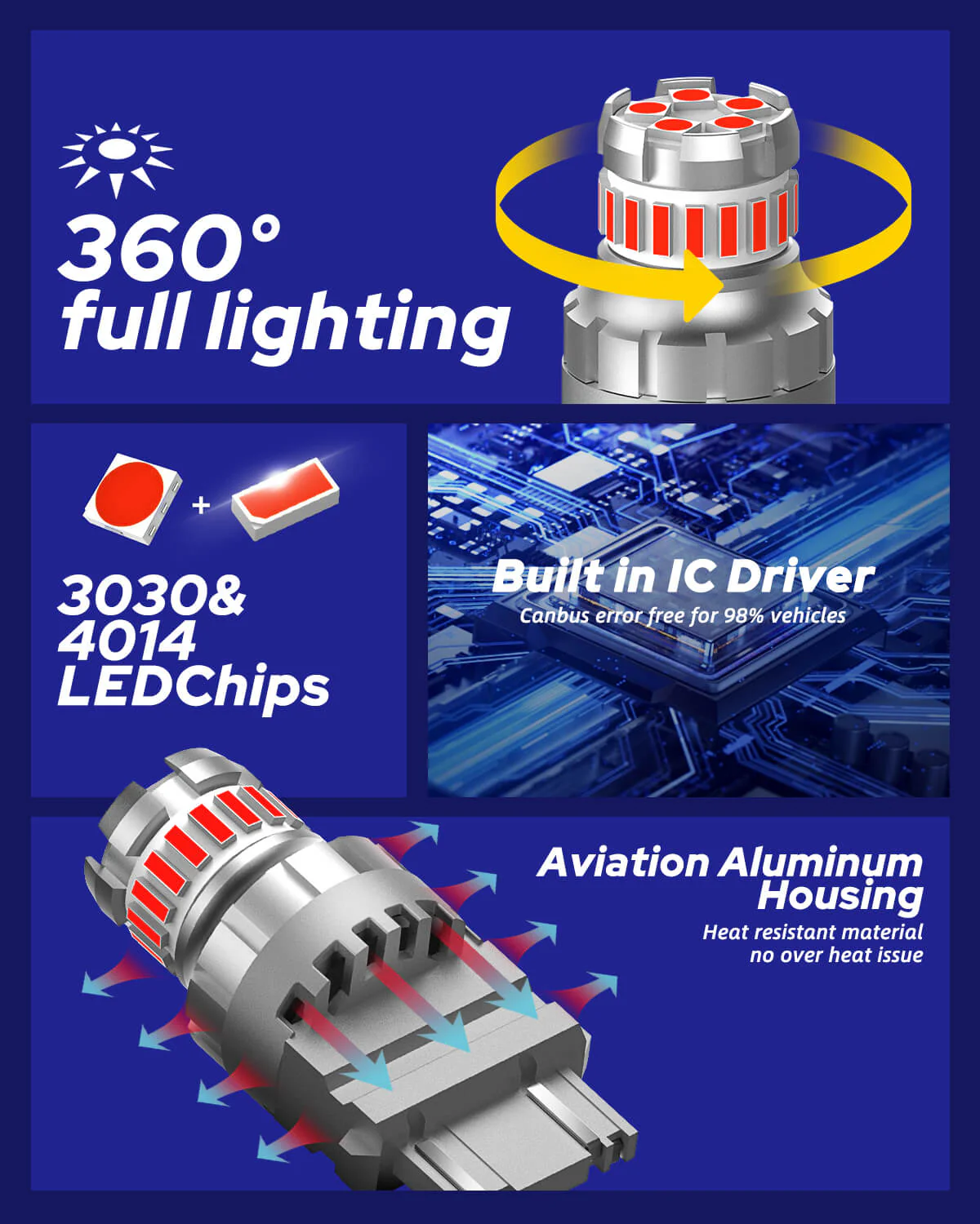 AUTOONE 3157 LED Red bulbs utilize newest powerful and high quality 4014 & 3030SMD led chips, 360°illumination, generating 300% brighter output than halogen. Ensure sufficient illumination brightness and distance, the warning effect is more obvious.