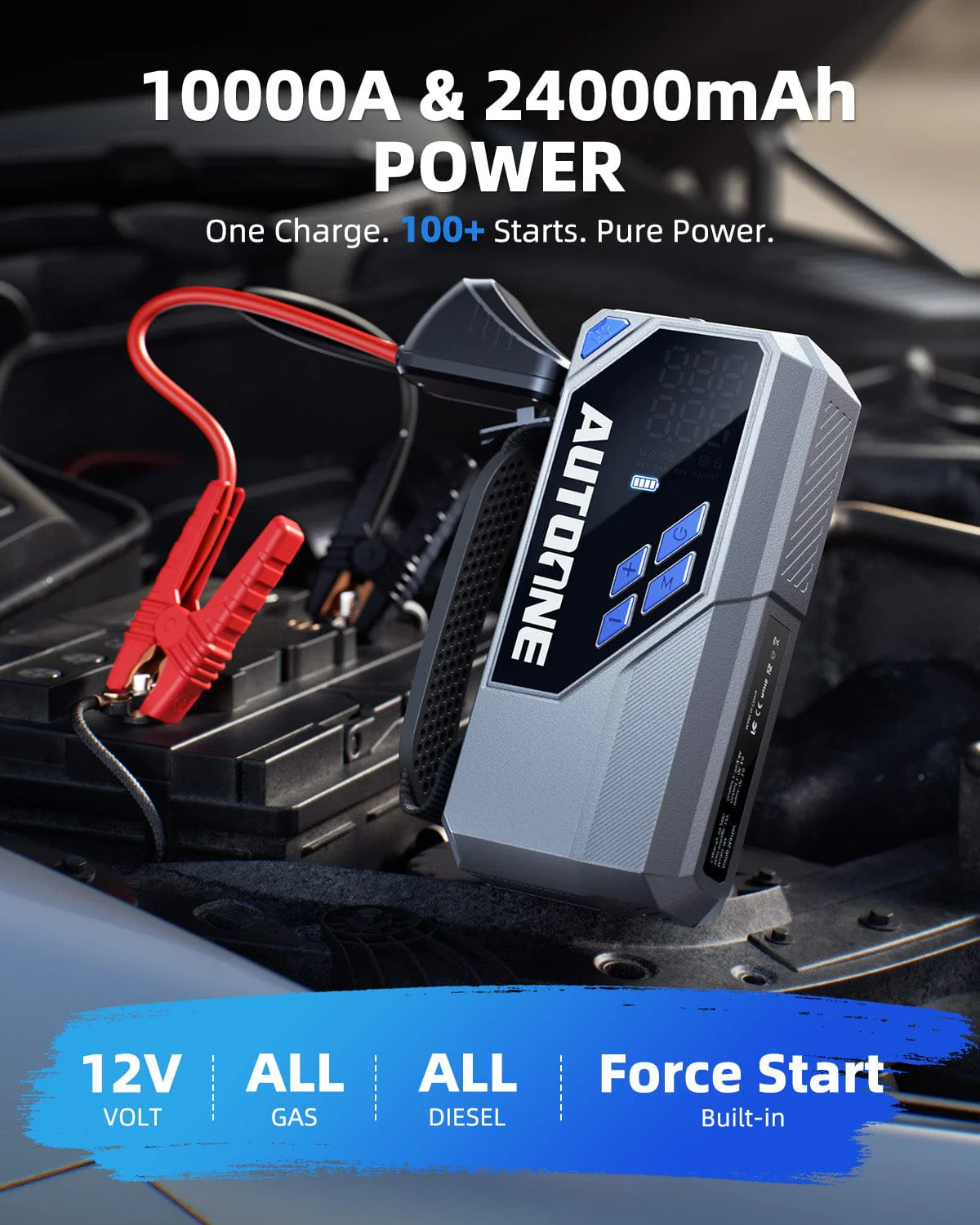 AUTOONE 10000A Jump Starter with Air Compressor, 24000mAh Portable Car Battery Booster Jumper Starter Pack (All Gas & Diesel) Jump Box with Tire Inflator, Jumper Cables, Type C, 60W Charging, Light