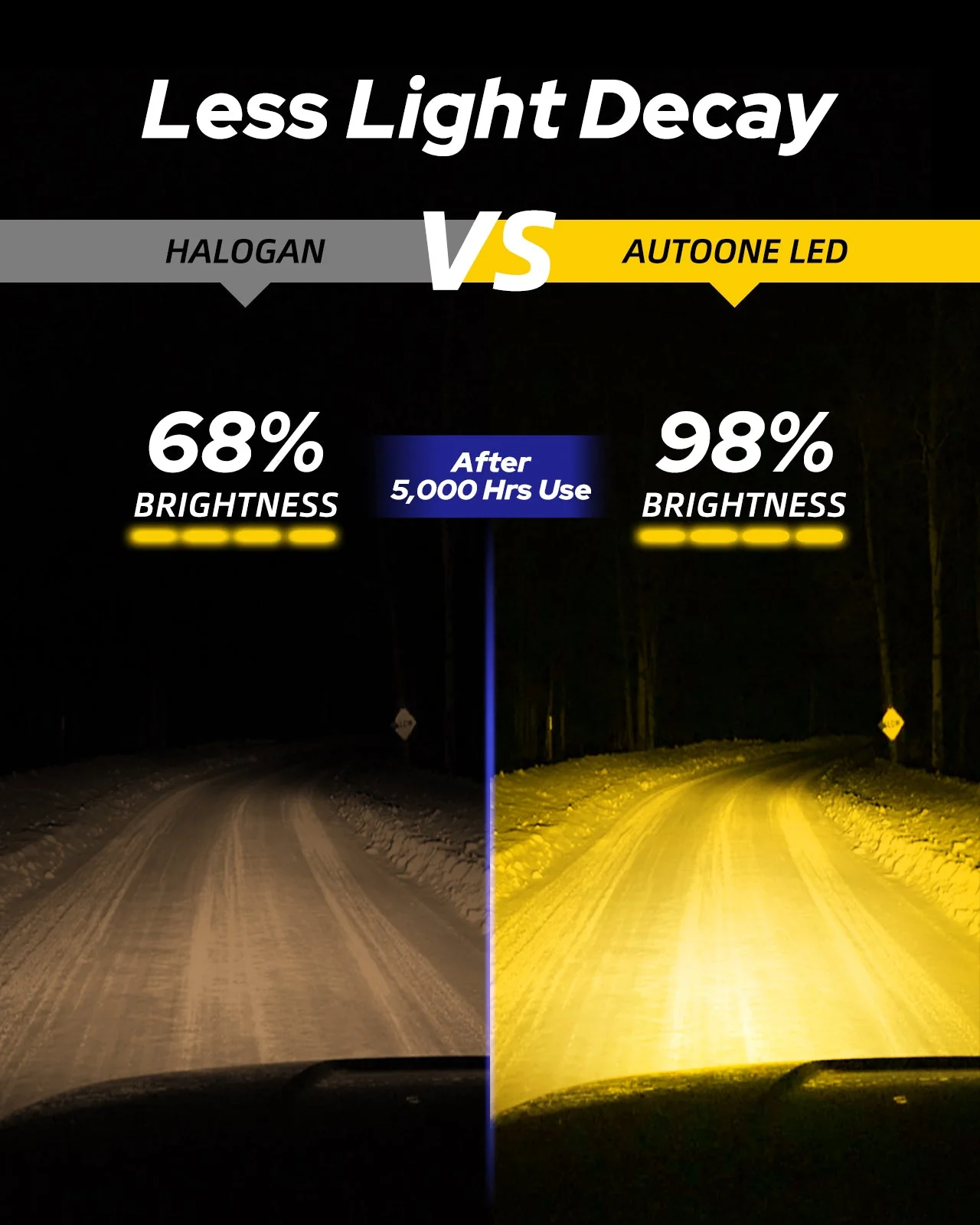 AUTOONE H11 led bulbs are equipped with high luminous efficacy CSP chips. And 1:1 halogen H11 bulbs’ beam pattern, spread out the light more to help in the side and front vision but not endanger overcoming drivers.