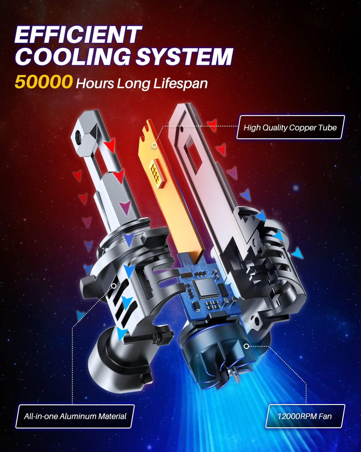 Long Lifespan: Built for durability, these bulbs feature a 50,000-hour lifespan thanks to the innovative radiator design and the supercooling capabilities provided by the 12,000 RPM turbo cooling fan.
