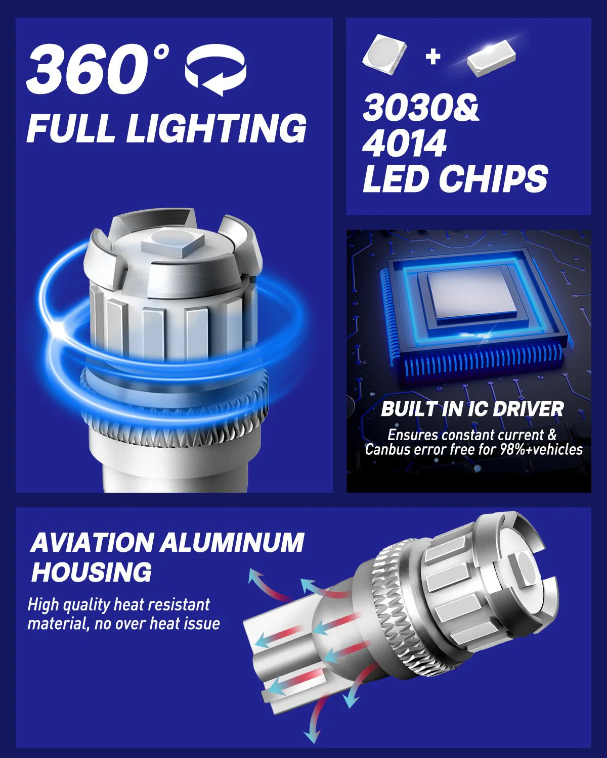 AUTOONE T10 LED Bulb adopts an aviation aluminum body, and built-in intelligent IC to optimize LED working temperature. Energy-efficient and better heat dissipation, extend the lifespan up to 50,000 hrs.